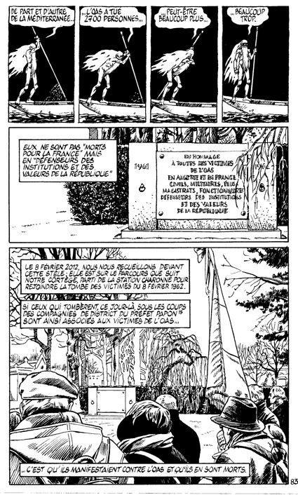 Jeanne Puchol ne se contente pas des souvenirs de ses proches, elle les met en vis-à-vis de très nombreuses sources et l’ouvrage est accompagné de notes et d’une riche bibliographie. Elle a ainsi fait œuvre de vulgarisation – au sens noble du terme – et de pédagogie, pour rendre compte avec une grande précision des faits, de leur réception dans la presse, de leur instrumentalisation politique, ainsi que des contradictions de certains témoignages. Beaucoup de chiffres sont cités dans cette bande dessinée. Que de morts, de disparus, de blessés, que de souffrance que l’auteure s’est astreinte à illustrer !… À la page 55, elle nous confie qu’elle peine parfois à trouver le moyen adéquat pour rendre compte de toute cette violence :