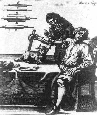 Le physicien irlandais Boyle résidait aussi à Oxford ou il conçut avec Robert Hooke la « machina Boyleana » ou « Pneumatical Engine » qui démontrait la nécessité vitale de l’air chez les êtres vivants avant d’énoncer la loi qui porte son nom (à température constante le volume d’un gaz varie en raison inverse de la pression). En 1656, il réalisa avec Wren les premières injections intraveineuses de diverges substances. Christopher Wren administra ainsi de l’opium dilué dans du Xérès à un chien qu’il voulait guérir de la mélancolie. « On doit, pour ce faire, apposer des ligatures aux veines, ouvrir la veine, puis introduire une mince seringue ou le tuyau d’une plume auquel on a fixé une vessie contenant la substance à injecter ». Le procédé qu’il décrit là sera l’ébauche de la seringue moderne reprise par Wood au XIXe siècle. Le chien survécut et fut même volé… Un autre de ses camarades Richard Lower réalise la « première transfusion » d’un chien à un autre quasi exsangue à l’aide d’un dispositif similaire. Ces expériences étranges sont relatées dans l’ouvrage célèbre de Boyle The Sceptical Chymist, mais aussi dans le Journal de Samuel Pepys. Ces grands scientifiques passèrent avec quelques siècles d’avance tout près de l’anesthésie et analgésie intraveineuse sans aller plus loin bien qu’une tentative ait été envisagée sur un domestique. Le but était de comprendre l’action des poisons sur l’organisme et le cerveau en particulier.