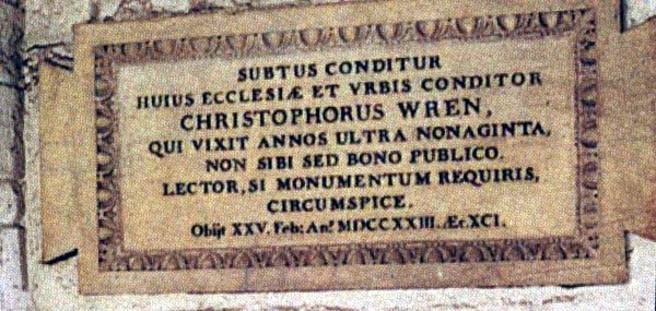 Il verra cependant achevé par les soins de son propre fils, les travaux de la Cathédrale Saint-Paul, son grand œuvre. Il mourut en 1723 d’une pneumonie à l’âge canonique de 91 ans et fut enterré dans la crypte de la Cathédrale Saint-Paul. Près de sa tombe est gravé « Lector, si monumentum requiris, circumspice » : « Passant si tu cherches un monument, regarde autour de toi ». Certains avancent qu’il faudrait plutôt lire : « Passant si tu cherches un tombeau, examine-toi ».