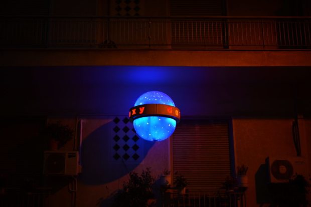 Il y a des moments où Athènes procure d’agréables surprises. Ou plutôt, une formule plus juste serait : où Athènes vous « intrigue ». Un soir, tard, alors que je marchais aux côté d’un ami qui se rendait chez son psychanalyste (ne pas considérer cette précision comme quoi que ce soit de plus qu’une mention contribuant à la description fidèle de l’épisode), la lumière bleu roi de cette planète bleue suspendue dans les airs a perturbé durant quelques secondes l’harmonie de l’espace tridimensionnel. Dans notre ville, habituellement, les lumières sont jaunasses. Ou blanchâtres – elles lavent la nuit de toute autre couleur. Mais le bleu, lui, est rare. Le bleu profond, plus rare encore. C’est ainsi que cette goutte lumineuse dans la nuit noire a exercé sur moi un charme. La boule bleu roi devant le bureau du psychanalyste donnait l’impression de n’être reliée à rien de terrestre. Elle flottait dans les airs entre les édifices avec la légèreté d’une plume. A croire qu’elle était d’un autre monde. Et durant quelques secondes à peine, le temps d’une illusion d’optique pour un passant, cette rue a pris la forme d’un tunnel noir dans l’espace. Les quelques pas que j’ai faits jusqu’au moment où l’illusion s’est dissipée, je les ai accomplis comme inconscient, ou plutôt avec une conscience bizarrement autre. Sous l’emprise d’une imperceptible sérénité. L’instant d’après, cette rue avait repris sa position habituelle face à l’opéra. La galaxie s’est révélé une enseigne lumineuse accrochée au mur de l’immeuble athénien, et j’ai sorti mon appareil photo de son étui. Mais une trace de ce sentiment d’étrangeté demeurait. Car l’inscription lumineuse ne renvoyait strictement à rien. Aucun magasin du nom de Galaxy dans cette ruelle, aucun café, aucune salle de billard, comme on aurait pu s’attendre avec un nom pareil. Pas non plus d’enseigne ou d’inscription à l’entrée de l’immeuble. Et ainsi, même fichée dans le mur, cette galaxie bleu roi ne venait de nulle part. A la fois sans attache, étrange, comme un voyageur de l’espace. Mon ami photographiait un chat qui nous regardait avec curiosité depuis la fenêtre d’un appartement au rez-de-chaussée du même immeuble. Athènes dresse continuellement devant nos pas ce genre de pièges bizarres. Des failles qui font perdre à notre conscience un peu de son orientation. Ainsi, l’entropie de la ville devient notre univers quotidien. Et nous, nous vivons dans une oscillation permanente entre le prévisible et l’inattendu. Cela fait aussi partie du charme étrange qui nous retient ici.