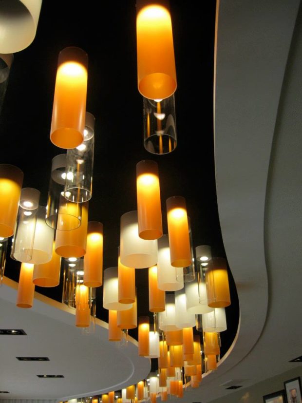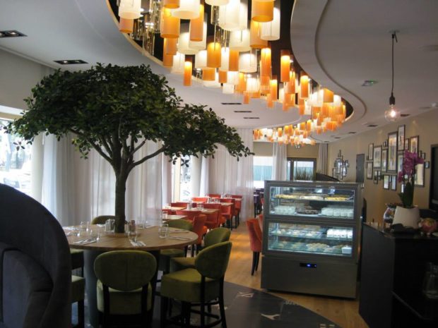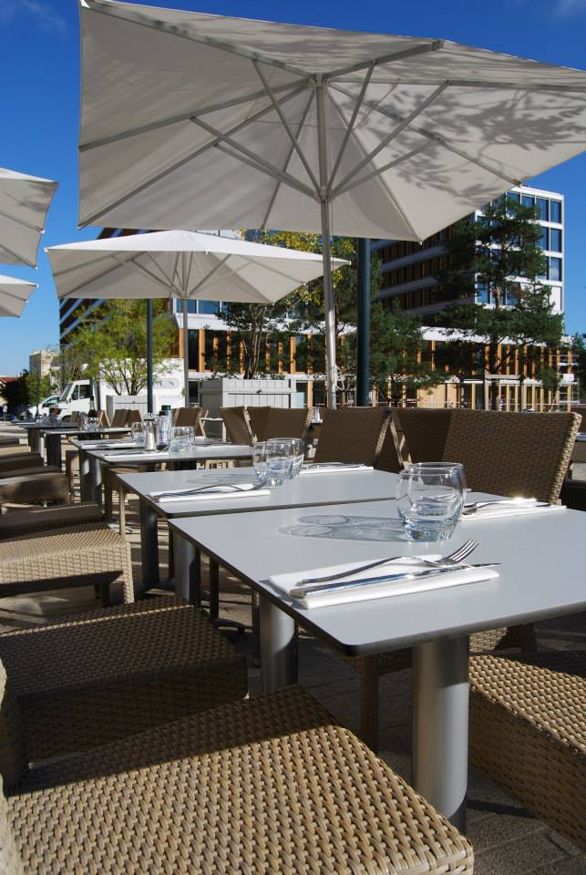 La vaste terrasse offre 80 places, prises d’assaut au moindre rayon de soleil dont on peut se protéger grâce à quatre immenses parasols. Pour les soirées d’été, le halo d’un gros pot lumineux introduit une lumière douce en même temps qu’un signal tendance. C’est l’esprit général du lieu, contemporain et chaleureux : l’aménageur (Créacom de Dinan) a su tirer parti du généreux volume intérieur en créant des espaces dissociés pour petites ou grandes tablées. On peut donc regarder un match de foot ou partager son anniversaire (oh, les beaux gâteaux !) en famille ou avec une bande de copains sans enquiquiner les autres convives.