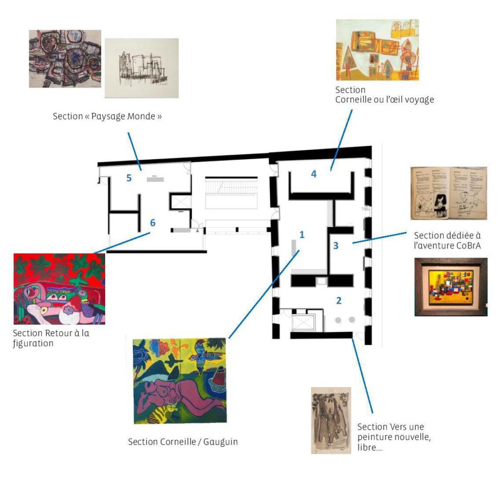 « Le premier espace réunit toutes les périodes de Corneille. À partir de ce principe, j’ai développé l’idée d’ouverture afin d’apercevoir les sections suivantes. Une sélection de grandes reproductions photographiques jalonnent également le parcours. Quelque part, elles incarnent l’œuvre et l’artiste », Eric Morin, scénographe de l’exposition