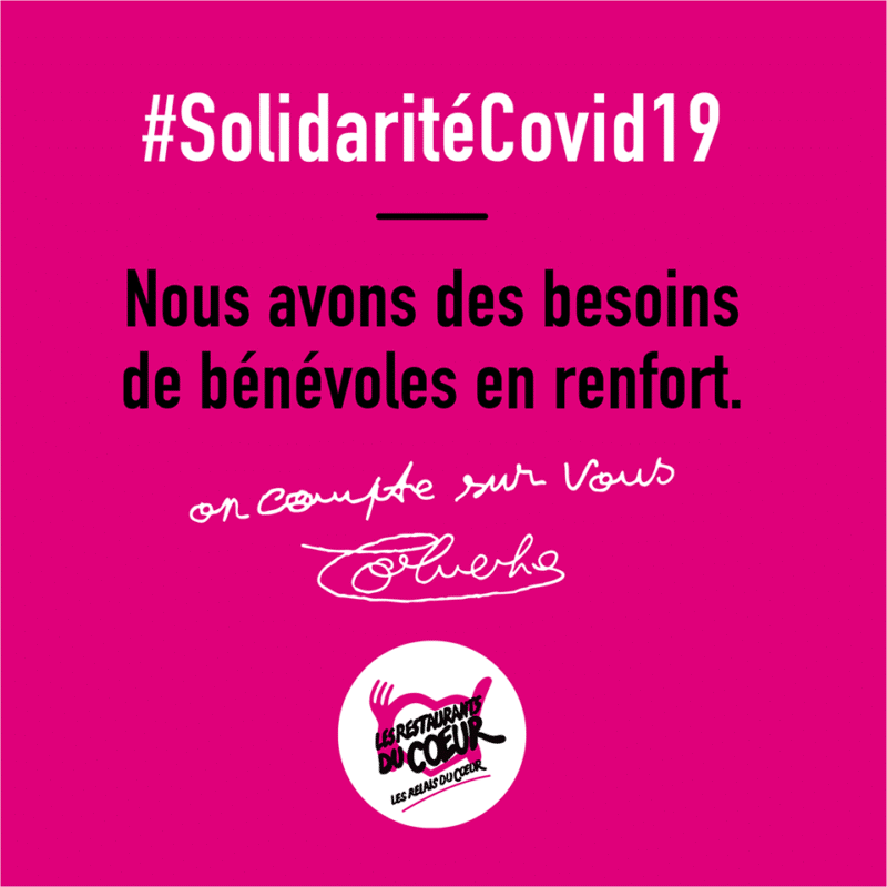 - Restos du Cœur : Leur mission d’aide alimentaire est plus que jamais essentielle. Ils ont besoin de mains pour aider ceux toujours à la rue : « Les Restos du Cœur ont besoin d’aide pour préparer des colis qui seront distribués à des personnes dans le besoin. Pas de contact public, consignes de sécurité respectées… » déclarait une publication . Plus d’informations ici