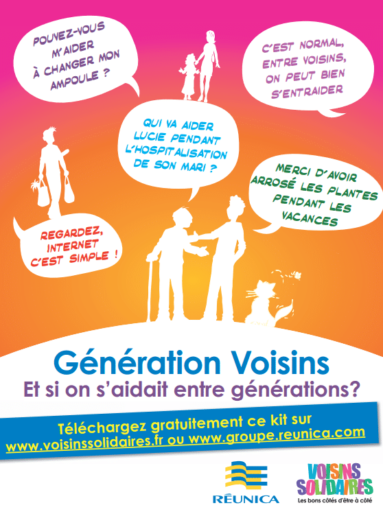 Créée en 2007 par Atanase Périfan, l’association française Voisins Solidaires a pour objectifs de renforcer les solidarités de proximité et de favoriser la convivialité entre voisins, en complément des solidarités familiales et institutionnelles. Dans le cadre de l’épidémie, l’association propose des affiches et des kits à coller sur la porte de son immeuble et inciter les habitants à frapper à la porte de leur voisin pour lui rendre service. Plus d’informations ici