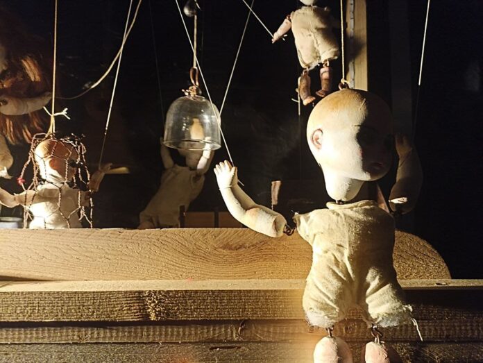 Le bouleversement dans le choix scénographique, orchestré par l’équipe en charge de l’exposition, saute aux yeux et montre un renouvellement appréciable. L’espace a totalement été repensé pour la nouvelle exposition Le Diable au corps. Pour éviter de laisser des traces de votre diabolique pèlerinage, les organisateurs et organisatrices ont pris le soin de tendre des bâches blanches du sol au plafond. L’endroit semble aseptisé, mais le souvenir d’une histoire morbide peut se lire entre les lignes de bandes de scotch rouge dans cet environnement aux allures d’hôpital désaffecté. Une marionnette disloquée va-t-elle surgir ? Dexter se cacherait-il quelque part ? Les adeptes d’hémoglobine apprécieront certainement le clin d’œil.