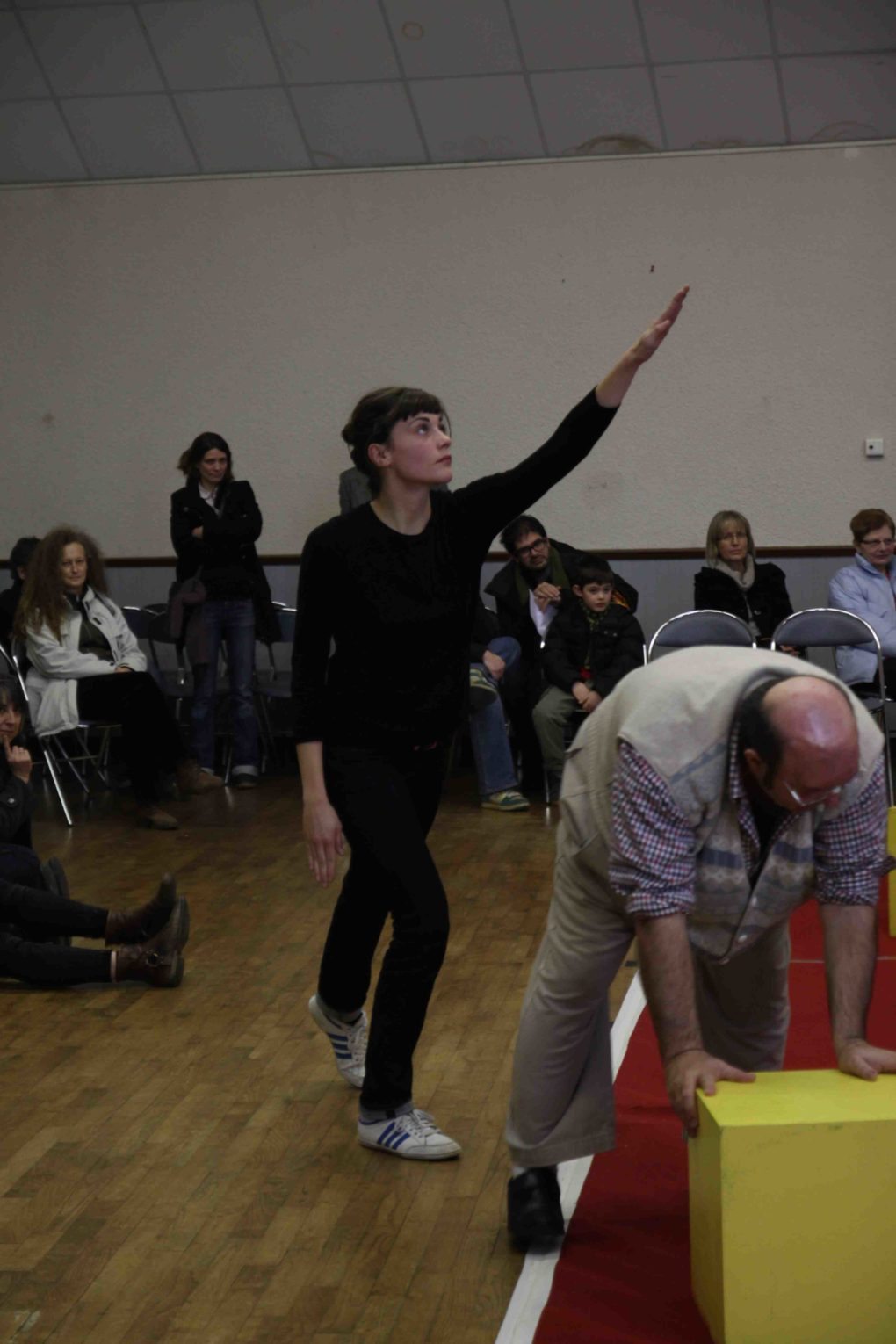 Le public pénètre dans l’espace de représentation. Au centre de la salle des fêtes de Bazouges la Pérouse, un tapis rouge occupe les trois quarts de la surface au sol. Y sont disposées des chaises, parfaitement rangées pour accueillir des spectateurs. Alors que ces derniers n’ont pas encore tous trouvé une place, une musique indus (Pan Sonic) séquencée, répétitive et oppressante, résonne ; le morceau Tugboat tournera en boucle jusqu’à la fin du spectacle. Le brouhaha qui précède habituellement les spectacles se prolonge et le public ne perçoit pas tout de suite que la représentation a déjà commencé.