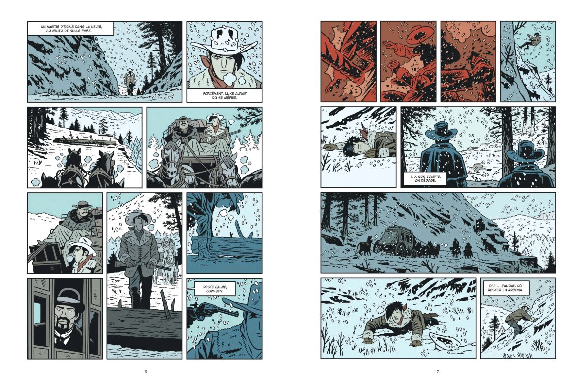 Sept récits, comme les sept péchés capitaux, indépendants mais aussi interactifs qui tracent un bel hommage à notre cow-boy solitaire bien dans les bottes de notre époque puisqu’apparaissent des femmes fortes, loin des entraîneuses de saloon. On découvre ainsi Lucy, incendiant le ranch de son tortionnaire, Miss Oakley une gamine tirant presque aussi bien que notre héros ou encore Grandma, une femme noire affranchie à la volonté farouche. A l’image de notre époque, l’humour et l’ironie apparaissent au second plan, laissant la place principale à une forme de noirceur et de pessimisme. La nostalgie est même de mise avec l’annonce de l’arrivée du chemin de fer, symbole de modernité, et de la fin de la conquête de l’Ouest.