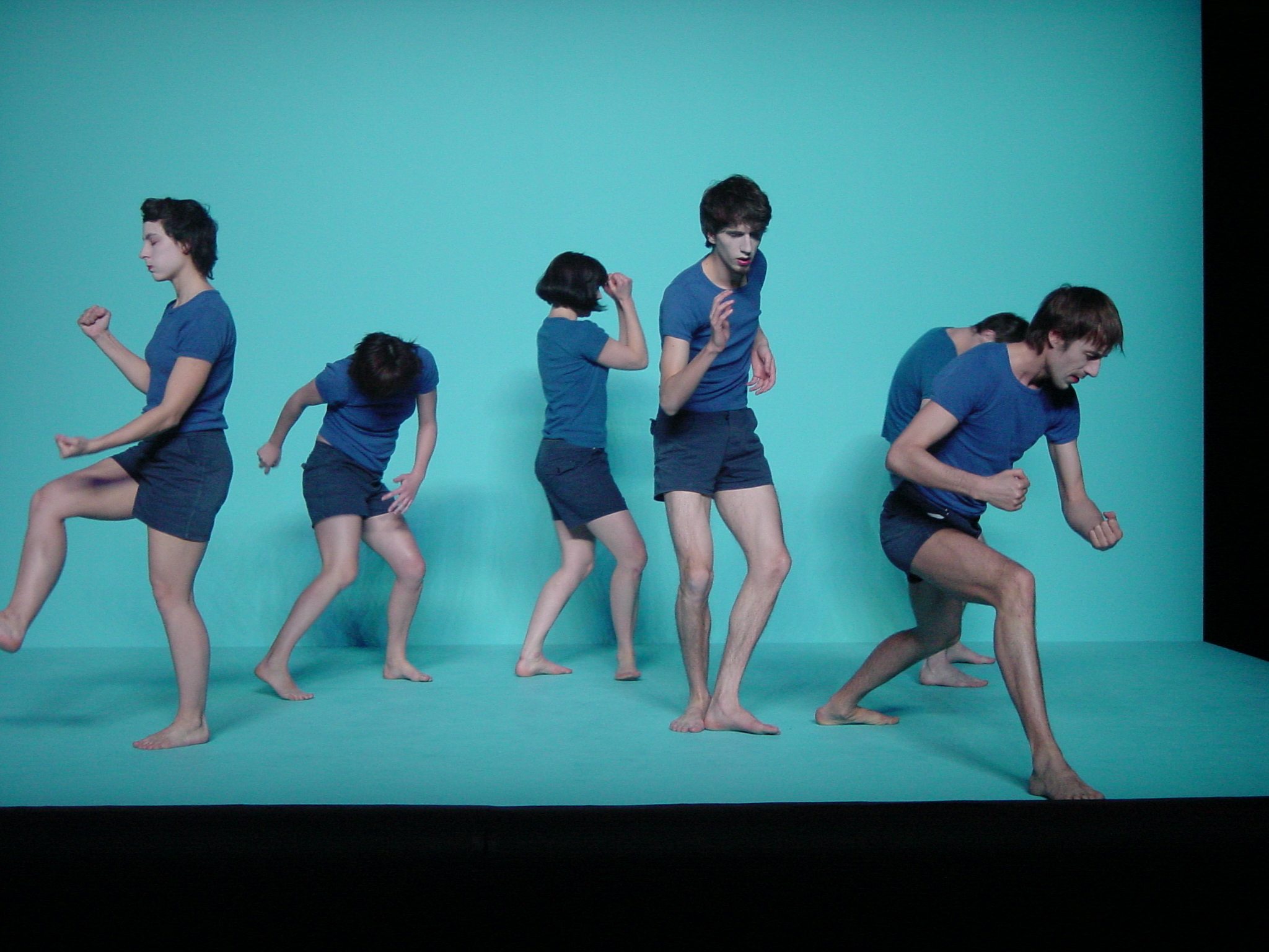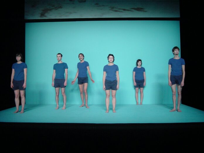 Les voici : juvéniles T-shirts et shorts bleus. Et comme l’avait souhaité la mère de Blanche Neige, le teint blanc comme la neige, les lèvres rouges comme le sang ou le maquillage des acteurs de films muets. Une évocation d’époques que personne ni sur scène ni en régie n’a connues suscite une atmosphère onirique ; peut-être aux origines de la danse contemporaine. Pas de musique pour nos trois danseuses et trois danseurs qui pénètrent l’espace imaginé comme de sages écoliers. Ils scrutent fixement le public et ne le lâchent pas. La durée de ce regard qui précède l’action des douze saynètes ne varie pas. Et le rituel reprend quand les figures quittent l’espace en fixant à nouveau ceux qui les voient, tels des chats figés par les phares de quelque voiture. L’empathie du public se tisse en faveur de ces danseurs surpris par une mort soudaine alors que nous venions juste de faire connaissance. Se succèdent les tableaux qu’ils animent avec le sérieux d’un Buster Keaton, attisant notre attachement, des bagarres, des lions, des danseurs de claquettes, des guerriers et, au final, la cavalerie (scène pour laquelle la forêt ensorcelée est descendue jusqu’au sol). Mais viennent-ils nous sauver ou sont-ils en train de réussir leur évasion de ces pièges burlesques ?