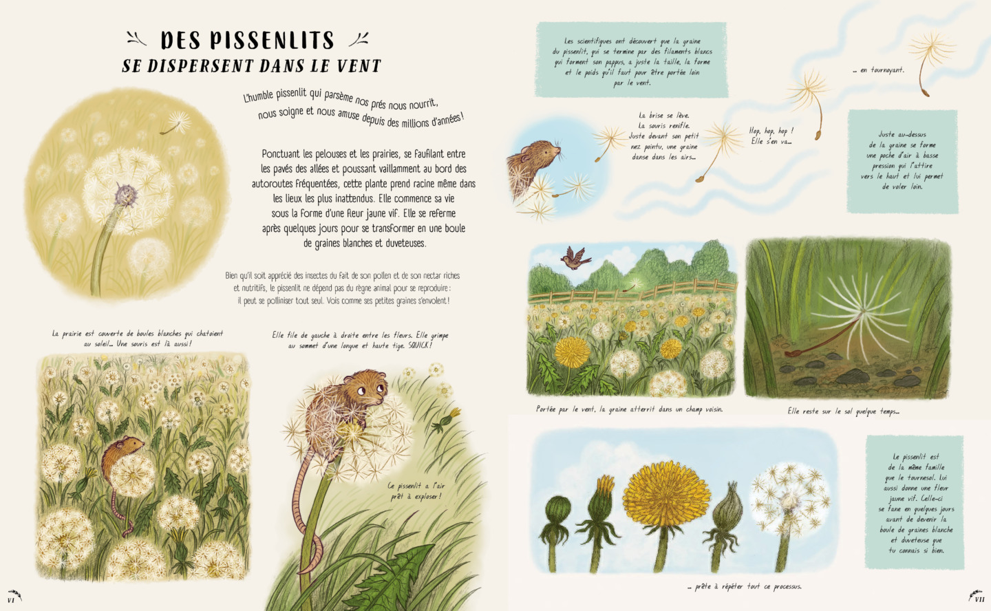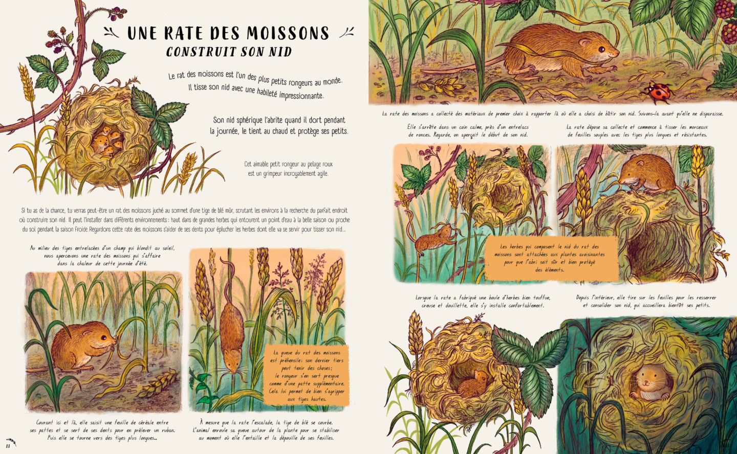 Le livre défile et nous voilà à découvrir les différents habitants du jardin. Laura Brand nous raconte leur histoire avec beaucoup de précisions et de détails, le tout délicieusement illustré par Freya Hartas. Savoureux et instructif, c’est un beau documentaire sur la nature qui se trouve juste à nos pieds, du champignon qui pousse au colibri qui boit, faune et flore sont décortiqués avec attention et illustrés avec douceur par notre duo d’autrices. Plongez dans l’univers des touts petits et visitez leur maison, dînez à leur table et profitez de la vie, nature peinture !