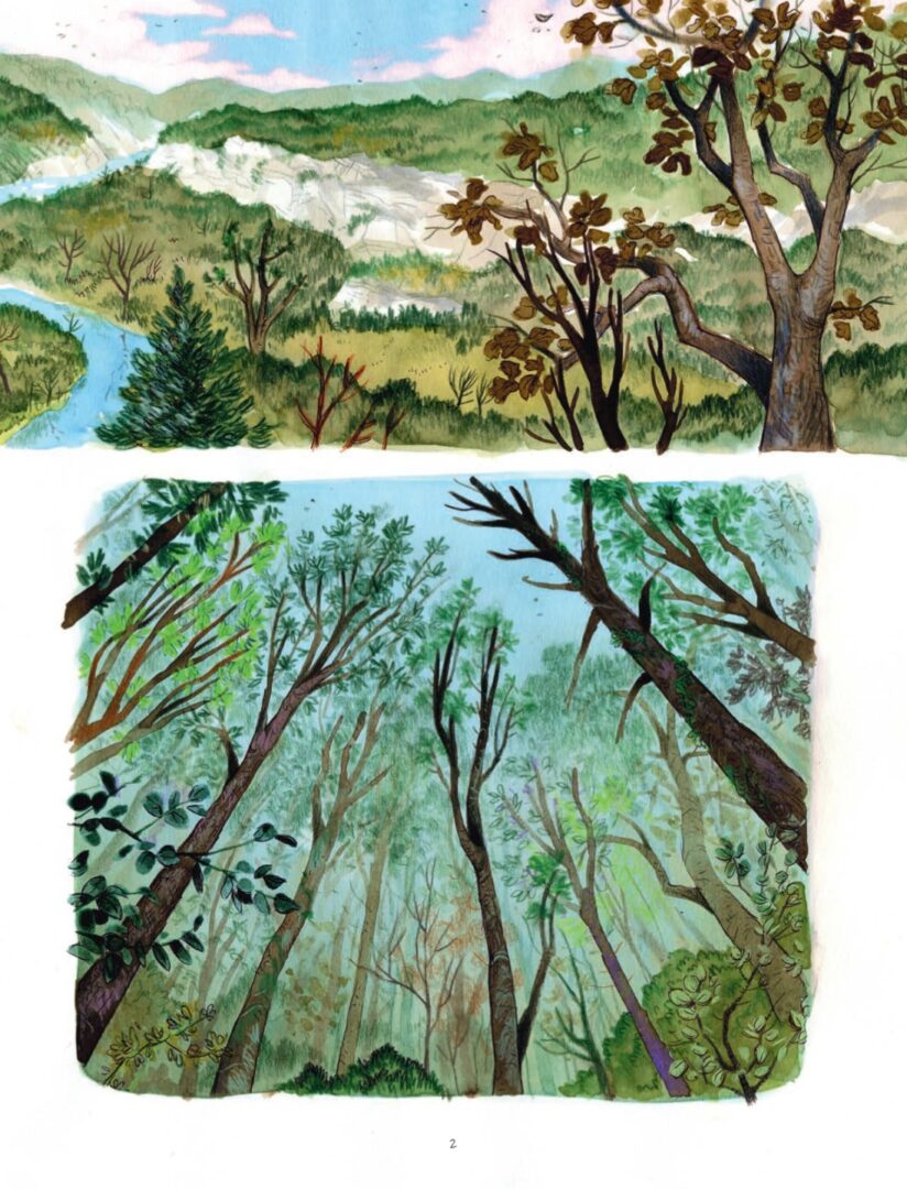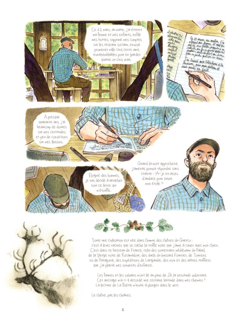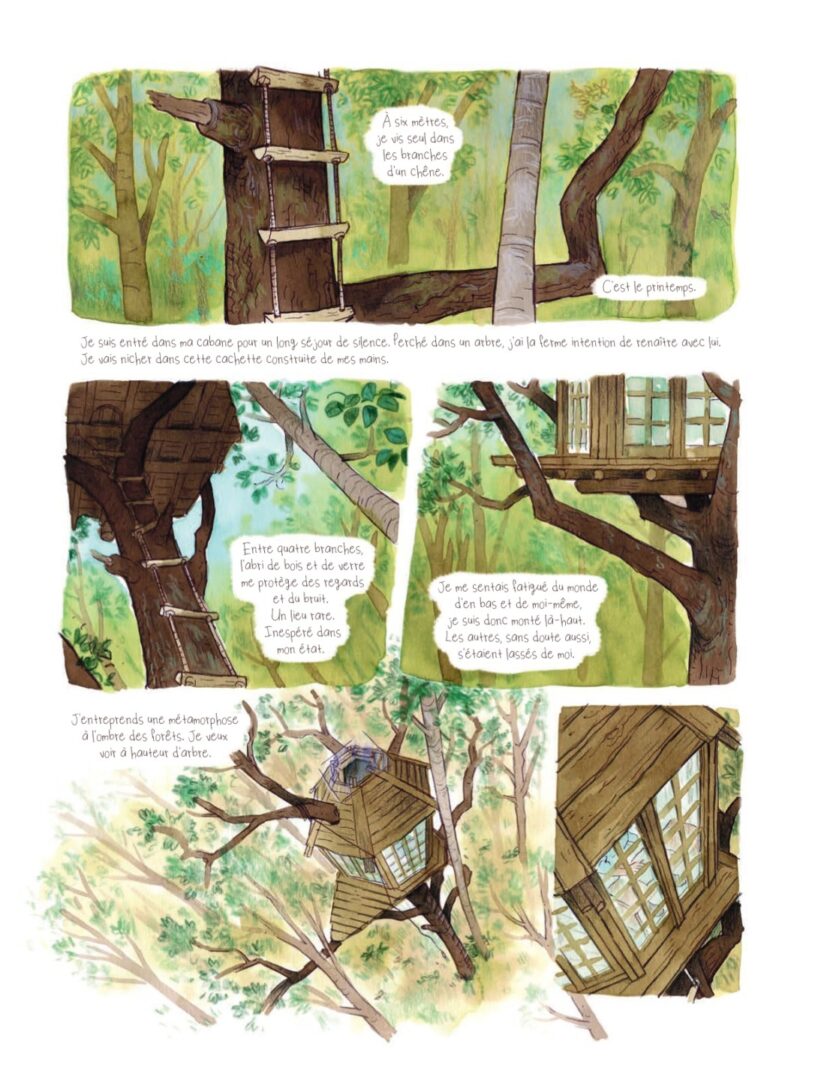 Plongez dans la vie d’un aventurier qui tente de se reconnecter avec mère nature. Édouard Cortès nous raconte l’histoire d’une vie qui défile en trois mois, perché sur cet arbre, un chêne majestueux qui lui rappelle l’importance de vivre, l’importance de profiter du temps et de l’espace, d’avancer non plus avec l’horloge humaine, ce tic-tac horripilant qui encadre le quotidien et nous étouffe de son aiguille aiguisée, comme pour nous rappeler o combien le temps est précieux et que nous en manquons cruellement. Dominique Mermoux le dessine avec puissance, peut-être celle du chêne… De véritables peintures s’invitent en cases sur les planches de la vie d’Edouard Cortès. La force de cette histoire réside dans la profonde humanité qui découle des pages, le héros bien que détaché du monde des hommes, ne peut s’empêcher d’y penser. Le passé se déroule en sépia et vient déranger la sérénité de l’instant. Il le sait, cette part de lui sera toujours là et le suivra durant toute sa vie. Vous aussi, mettez-vous au vert, le temps de la lecture de cette bande-dessinée, aussi courte qu’un instant mais aussi magique que l’éternité… Une véritable ode aux arbres et à la nature !