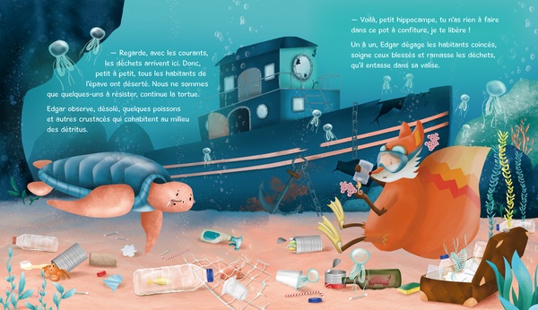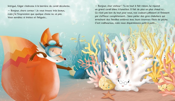Notre renard préféré est de retour pour parler écologie ! Les eaux vont mal, les coraux se décolorent, les méduses disparaissent, des algues toxiques apparaissent… Plongez dans l’océan blessé et sauvez-le aux côtés de notre héros aventurier, apprenez et comprenez la nature, protégez-la des méfaits de l’homme et revoyez le sourire de ses habitants ! Un album sur l’importance des océans et de l’impact des actions humaines et de la pollution qui en découlent. Une nouvelle histoire peuplée de plein de petits personnages qui nous rappellent la vie fragile dans la mer.