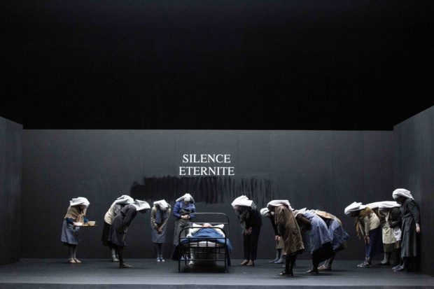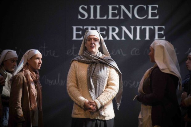 Au service de ce parti-pris de s’éloigner des faits historiques et de l’époque révolutionnaire, Eric Chevalier propose un décor des plus épurés. Cinq pans de murs noirs, quatre rampes de néons délivrant une lumière blafarde, un mobilier minimaliste. Sur l’un des murs, une inscription permanente : silence éternité. Au fil du drame, les carmélites y inscriront à la craie différentes sentences puis les effaceront. L’idée est plutôt bonne, elle évoque les inscriptions des prisonniers sur les murs de leurs cellules et rappelle que l’entrée au carmel est une volontaire privation de liberté (extérieure) en même temps qu’elle préfigure l’embastillement des carmélites. Cependant, si ce choix de mise en scène – qui rappelle celle d’Olivier Py au Théâtre des Champs-Élysées en 2013 – permet de combler quelques temps morts, il en crée d’autres.