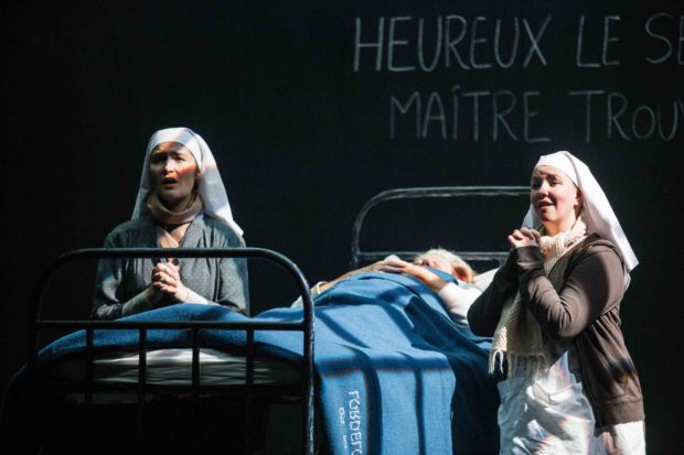 L’ensemble de la production profite de voix judicieusement distribuées. Martine Surais nous offre une remarquable Madame de Croissy. Sa voix évoque la maturité et la force, sa diction est parfaite, quant à son jeu de comédienne, il donne au personnage toute son ampleur ; Martine Surais donne le meilleur de sa longue expérience. Blanche de la Force est très bien incarnée par Blandine Arnould. S’il n’y a rien à redire sur sa performance vocale, son jeu est quant à lui assez monotone et plutôt crispé, mais c’est aussi le rôle qui veut cela – Blanche est inquiète, vulnérable et obsédée par la mort ; il faudra attendre la scène finale pour la voir enfin rayonnante de beauté. Karine Audebert obtient à l’évidence les faveurs du public. Il faut dire que sa voix puissante et généreuse colle parfaitement avec le personnage de mère Marie. Le rôle de Madame Lidoine profite de la technique très maîtrisée de Sylvia Kevorkian. Quant à Violaine Le Chenadec, sa voix fraiche et cristalline s’accorde à merveille avec le caractère vif et enjoué de Sœur Constance qu’elle campe avec un naturel confondant. Il serait injuste d’oublier le chœur de l’opéra de Rennes qui fait corps avec les personnages principaux sous la direction de Gildas Pungier. Ce dernier, en amoureux de la voix, tire le meilleur des solistes et du chœur réussissant à créer une belle unité qui nous suggère qu’au fond il n’y a – exception faite de l’aumônier très bien tenu par Olivier Hernandez – qu’un seul personnage : le carmel.