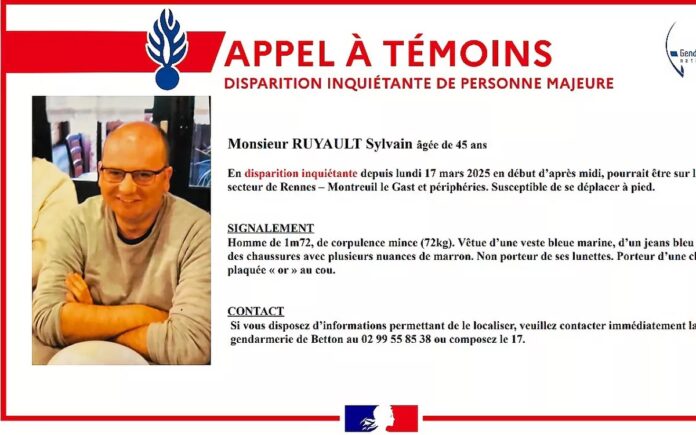 La compagnie de Rennes de gendarmerie a diffusé un appel à témoins concernant la disparition de Sylvain Ruyault, 45 ans, survenue le lundi 17 mars 2025. L’homme pourrait se trouver entre Montreuil-le-Gast et Rennes.
