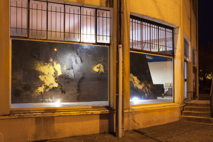 Le récit du son et du plan comme matériaux plastiques et comme expérience. Reprenons plus en détail ce combat. Sur cet immense plan, s’affronte la matière noire, mat et brillant. Plusieurs déflagrations chimiques ont créé la lumière mêlée à ce chaos. Ce que l’on a devant nous (si on est devant les panneaux de La Dynamique des fluides), c’est un cosmos, ou plutôt la photographie d’un cosmos. Un état de la matière qui est entre l’état solide et l’état gazeux. Mais la première idée qui nous vient est belle et bien liquide. On imagine facilement une matière visqueuse et noire à travers laquelle la lumière a du mal à percer. Et souvent, ce qui retient la lumière nous inquiète, plus encore quand cette matière est noire, parce qu’elle cache et elle maquille le son, la connaissance, le support. Ce qui est caché, c’est aussi l’avant et l’après, le passé et le futur de la dynamique. Reprenons les mots de Borges qui font mouche :