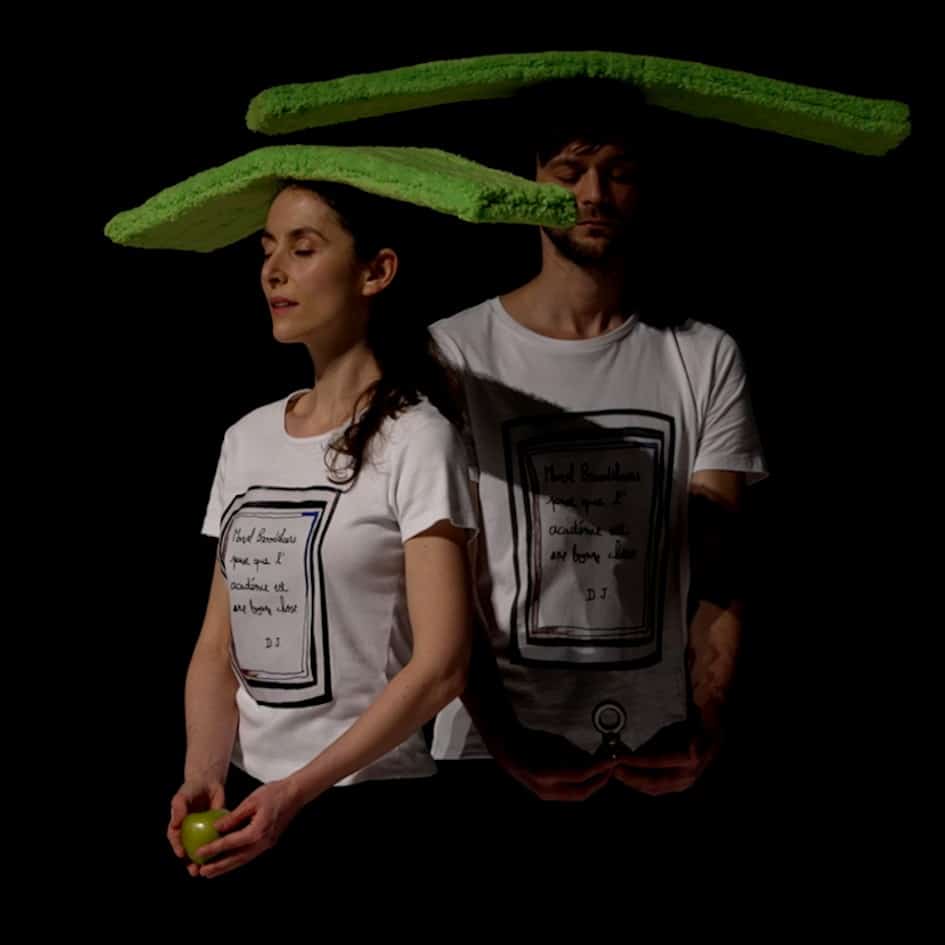 Serpillières vert pomme sur la tête, yeux fermés, pomme verte et clé en main. Musique celtique. Equilibre lent jusqu’à déposer leur objet devant le public.