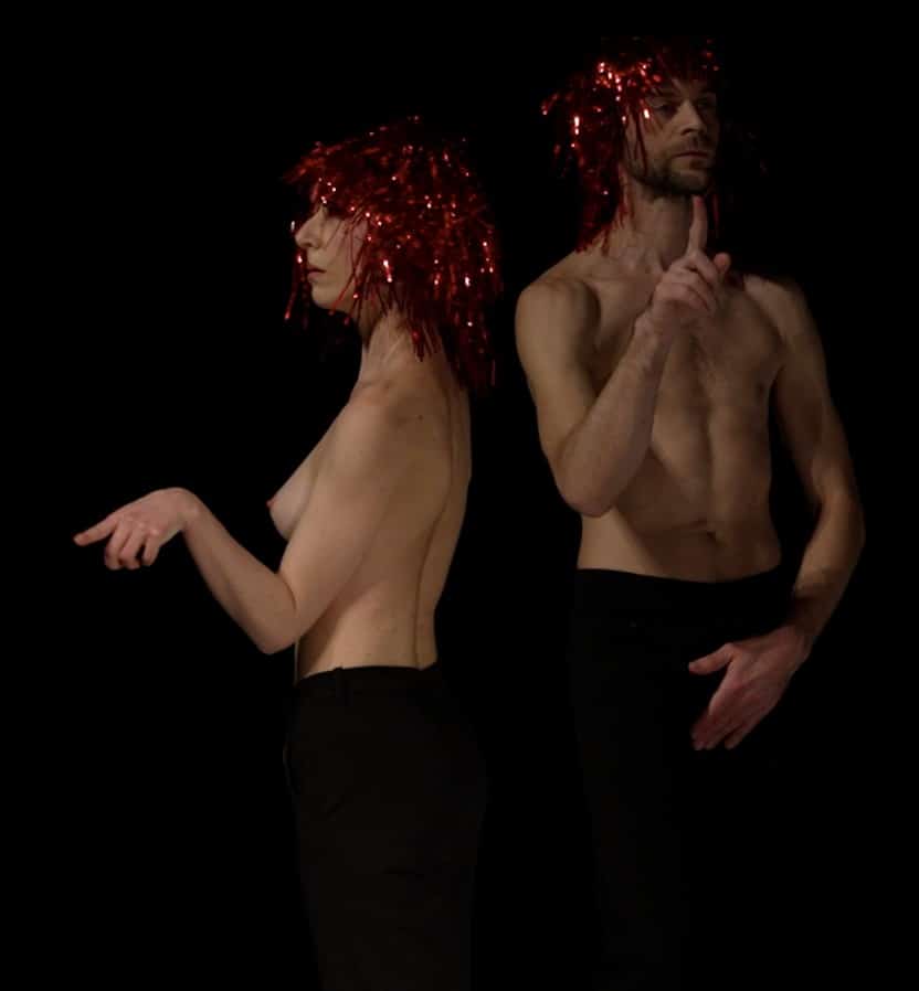 Perruque de fête. Doigt pointé. Main couvrant le sexe. Torse nu. Cloches de vaches de montagne. Ils sont deux. Accès à la sexualité d’Adam et Eve. Maladresse. Perdus. Ventres creusés.