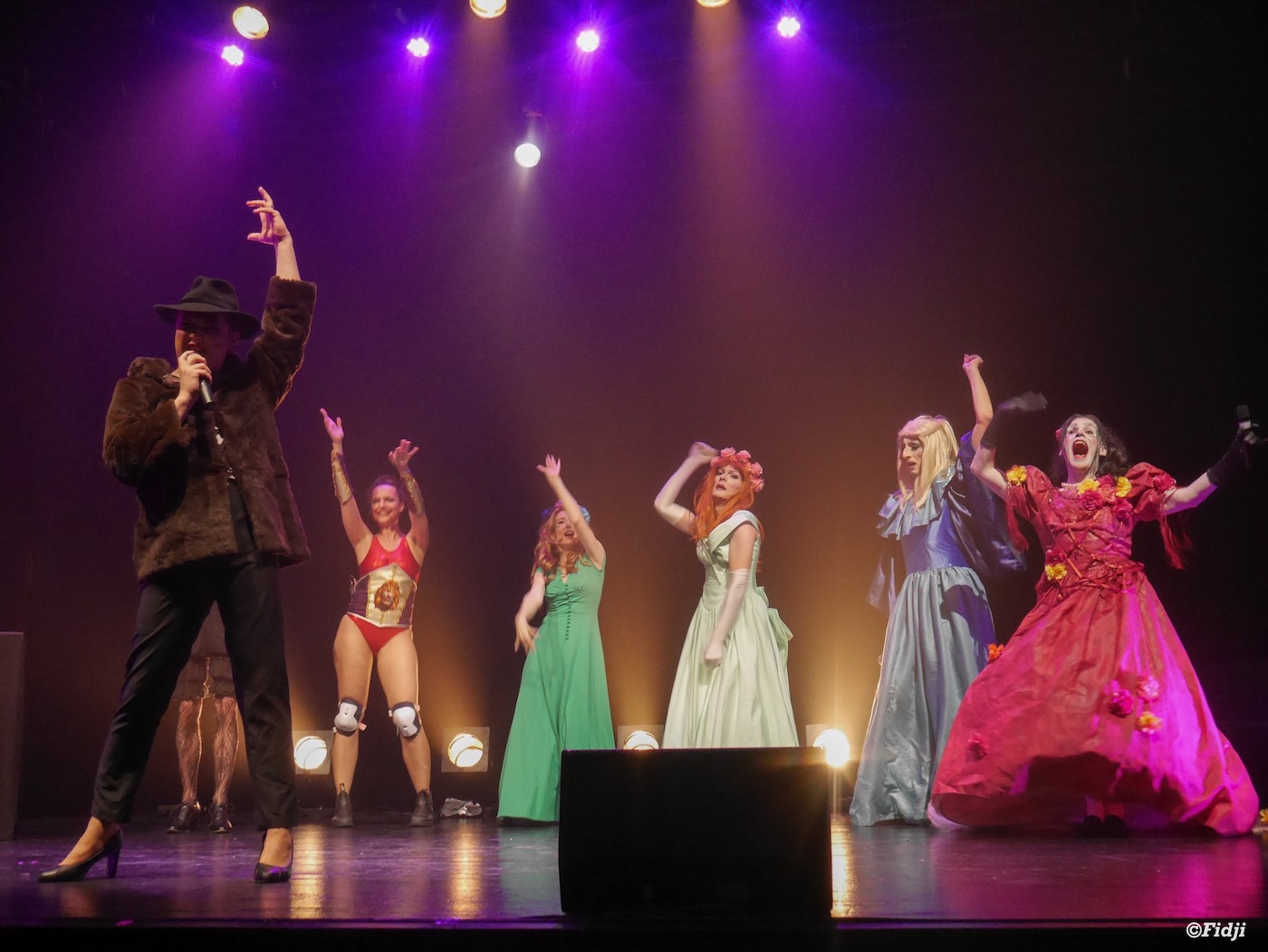 Car c’est bien la performance artistique qui est au centre des spectacles de la DRAG. Comme souvent dans les drag shows, les artistes confectionnent leurs costumes, composent leurs maquillages et présentent des numéros de lip-sync, c’est-à-dire des performances dansées et chantées sur des airs connus. Mais la DRAG brille surtout par son amour d’un cabaret bariolé. Elle met l’accent sur une variété de prestations, de la plus émouvante à la plus grotesque. Ainsi, on trouve dans ces revues de l’effeuillage burlesque, du chant, de la musique en live, de la marionnette, de la danse, du butō (forme de danse contemporaine venue du Japon), des sketches ou encore du transformisme (le fait de se déguiser en une personnalité connue, comme Dalida ou Nathalie Appéré). Le tout est approximativement ponctué des interventions rigoureusement hilarantes de l’animateur David Perrot et de ses personnages plus ou moins glamours, Davina Vicious, Claude 2 De Dieu ou encore Nathalo Apéro.