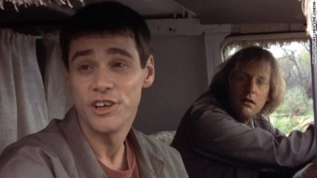 Dès le départ, Dumb et Dumber assume sans vergogne sa stature d’héritier contemporain des classiques du cinéma américain d’antan. Ses protagonistes se nomment Harold et Lloyd (à la façon d’un grand nom du muet). La coiffure de Jim Carrey est celle d’un des trois Stooges (auxquels les frérots rendront hommage vingt ans plus tard à travers leur film éponyme). Chaque gag puise sa teneur burlesque d’une nécessité de la cruauté gratuite, d’une souffrance physique établie en étendard, d’un timing frénétique et de l’expressivité d’une parole politiquement incorrecte se contrefichant des normes et de la bienséance.