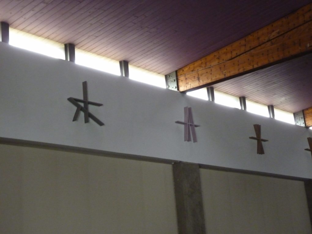 Tout aussi surprenant est le chemin de croix. Composé d’idéogrammes, il décline de station en station une même croix centrale. Une œuvre de Pellerin qui donne une dimension spirituelle tout en mouvement intérieur… A voir de préférence quand l’église est ouverte à l’exercice du culte.