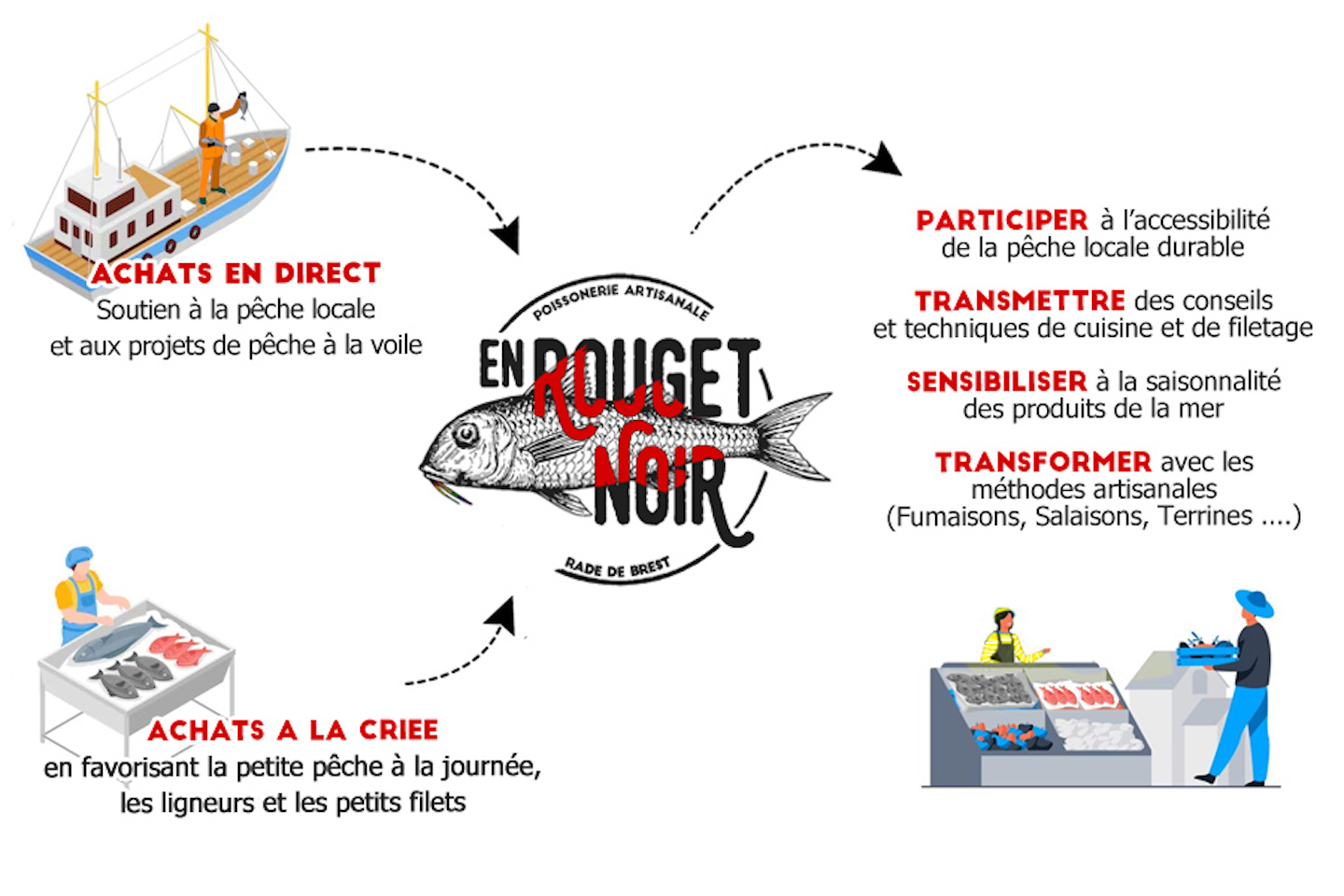 - Des achats en direct des pêcheurs pour les soutenir au juste prix, ou des criées locales en sélectionnant la petite pêche responsable