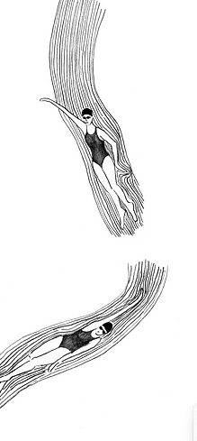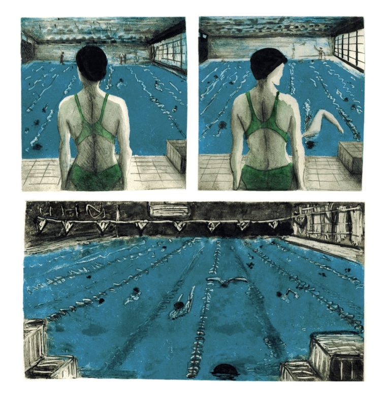 C’est à cette période de sa vie, que Marie Baldet pratique de plus en plus la natation. Cette discipline sportive l’aide à éloigner les problèmes auxquels elle doit faire face ! Le contact physique avec l’eau devient une révélation, une véritable thérapie et une passion pour elle. En 2017, elle décide de retranscrire son expérience personnelle sur le papier. À travers ses dessins, elle raconte sa métamorphose et en septembre 2022, elle réussit à financer l’édition de son premier ouvrage à 200 exemplaires. Aujourd’hui, elle se consacre exclusivement à son travail d’auteure et au récit graphique et navigue sur deux rivières parallèles, le paysage et l’art, qui parfois se rencontrent…