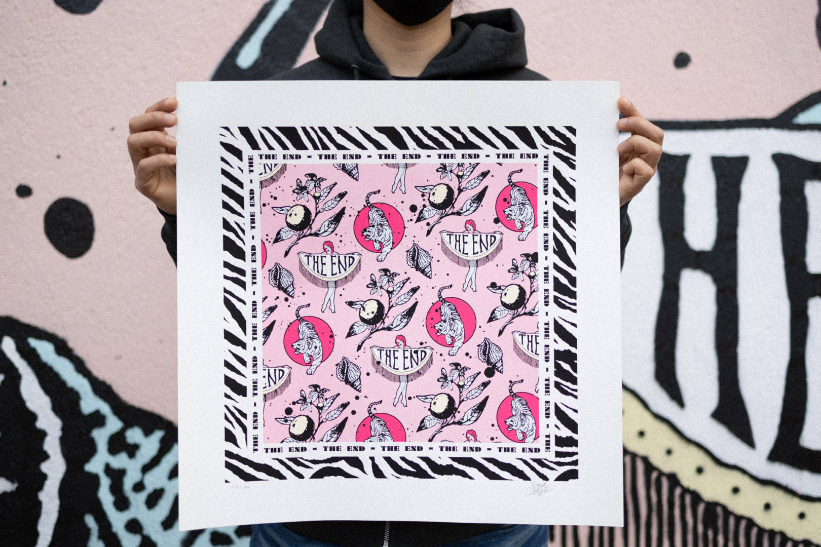 « The End » est une réflexion sur les effets du réchauffement climatique. Masqué derrière une iconographie festive et colorée, le propos est grave et amène l’observateur vers une prise de conscience : « Ces belles choses sont vouées à disparaitre si nous ne changeons pas notre mode de vie ».