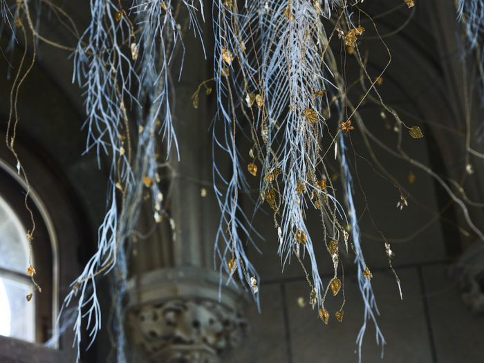 Installée dans une tourelle, Ada est un clin d’oeil discret à l’histoire du lieu. Stigmates des convulsions de l’histoire, le château subi de lourdes destructions lors des bombardements en 1944 de la Royal Air Force. La nature s’est par la suite immiscée dans les failles du temps et de la pierre à l’image des feuilles de laiton et de cuivre ainsi que des lianes de polyuréthane d’Eva Jospin. Aérienne, l’oeuvre se déploie tel un lustre faussement végétal. Poétique aussi comme l’est le motif des ruines cher au peintre Hubert Robert (1733-1808). Celui que l’on surnommait alors « Robert des ruines » imaginait volontiers la Grande Galerie du Louvre à ciel ouvert, nourri très certainement de ses souvenirs des vestiges antiques observés et croqués lors de sa visite à Pompéi.