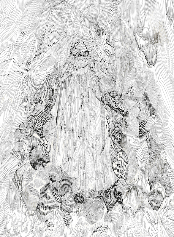 Les Dryades, divinités des bois, nous appellent sous la verrière de l’écurie où a pris place l’installation Panorama, présentée en 2016 dans la Cour Carrée du Louvre à Paris. Un environnement immersif, le mot est à la mode dans l’art contemporain, où se joue un rapport immédiat au corps, au sensible. En résonance à la majesté du parc du domaine, la forêt d’Eva Jospin domine les visiteurs. L’espace circulaire que constitue l’installation s’apparente à une clairière qui, en dépit d’une lumière naturelle et d’une sensation de respiration, est mise en valeur par un éclairage artificiel. Les plans se superposent et les jeux d’ombres créent de la profondeur et du volume. À travers cette forêt de papier, presque un pléonasme, l’oeil essaie difficilement de se frayer un chemin. Une forêt dense qui s’appréhende autant dans une perception d’ensemble qu’en étant attentif aux détails : l’écorce des arbres, les effets de strates, de roches dans le carton, les lianes… Elle s’impose tout de même par sa verticalité à l’instar des forêts de Magritte où le Jockey est… perdu. Comment rompre la monotonie du paysage ? Par des formes tortueuses ou les entrelacs des branches par exemple.