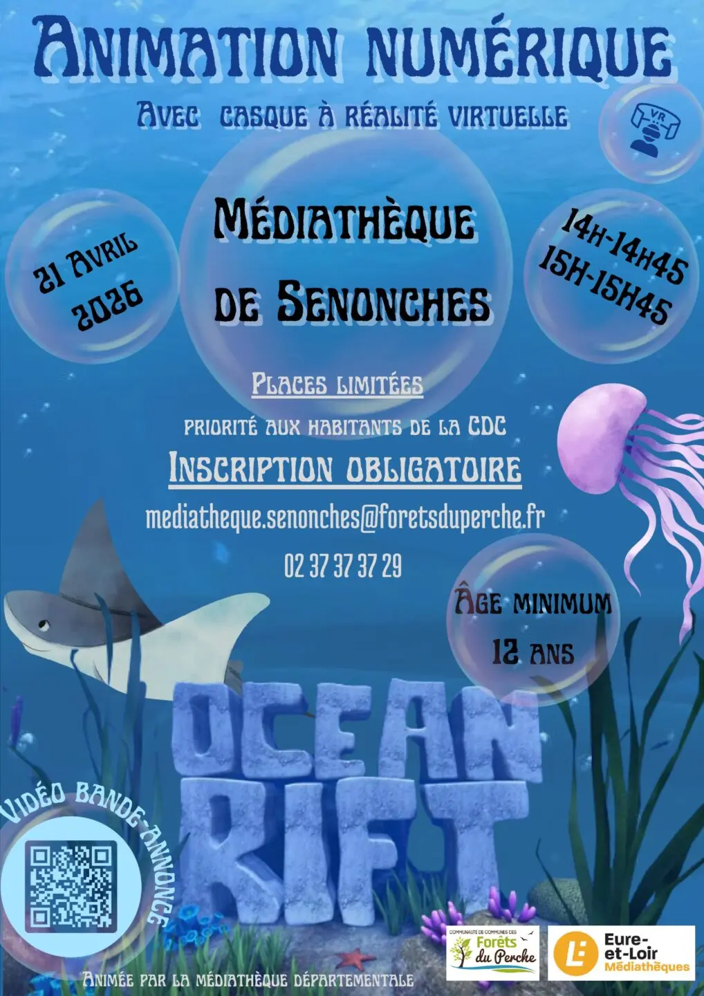 La médiathèque de Senonches à la plaisir de proposer aux jeunes de plus de 12 ans une animation numérique avec casques de réalité virtuelle. Une aventure immersive autour du thème de l’eau. Inscription obligatoire, nombre de places limité sur les deux créneaux disponibles.