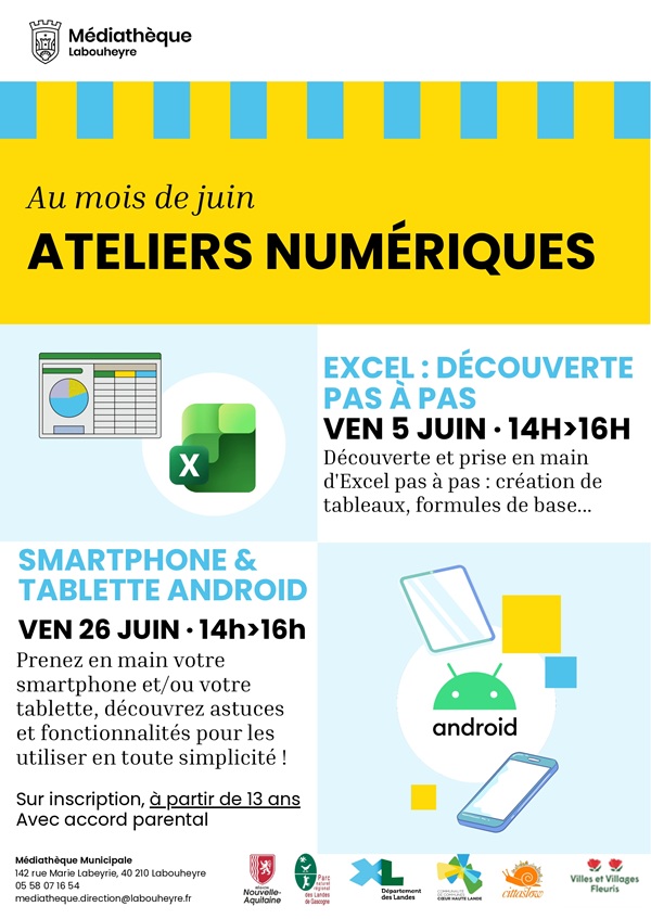 Atelier numérique (Débutant) Smartphone et tablettes Android Médiathèque Jean-Louis Villenave Labouheyre vendredi 26 juin 2026.