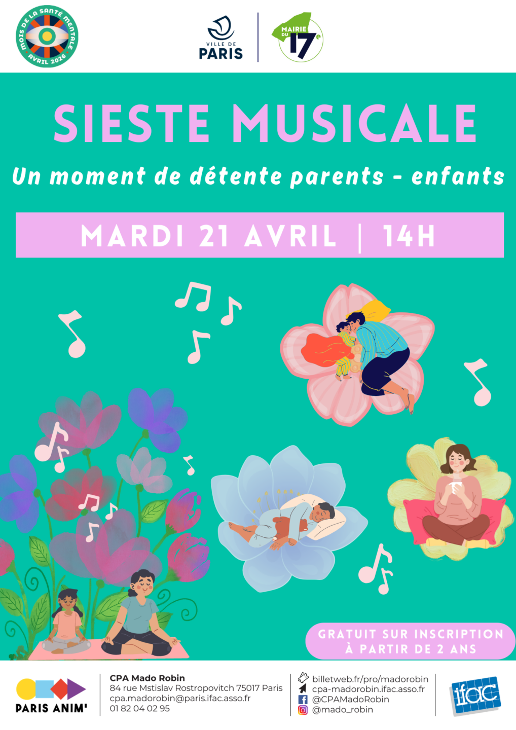Gratuit sur inscription à l’accueil du Centre, par téléphone au 01.82.04.02.95 ou par mail : cpa.madorobin@paris.ifac.asso.fr