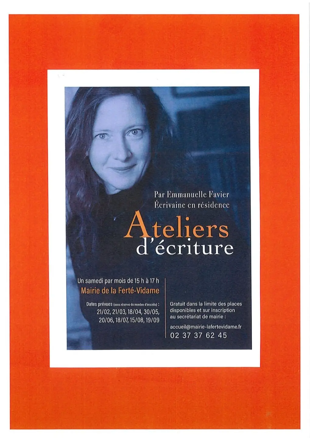 Ecrivaine en résidence, Emmanuelle Favier, vous propose des ateliers d’écriture au sein de la mairie de la Ferté Vidame. Pour tout renseignement et inscription, veuillez joindre la mairie de la Ferté Vidame. Attention places limitées.   .