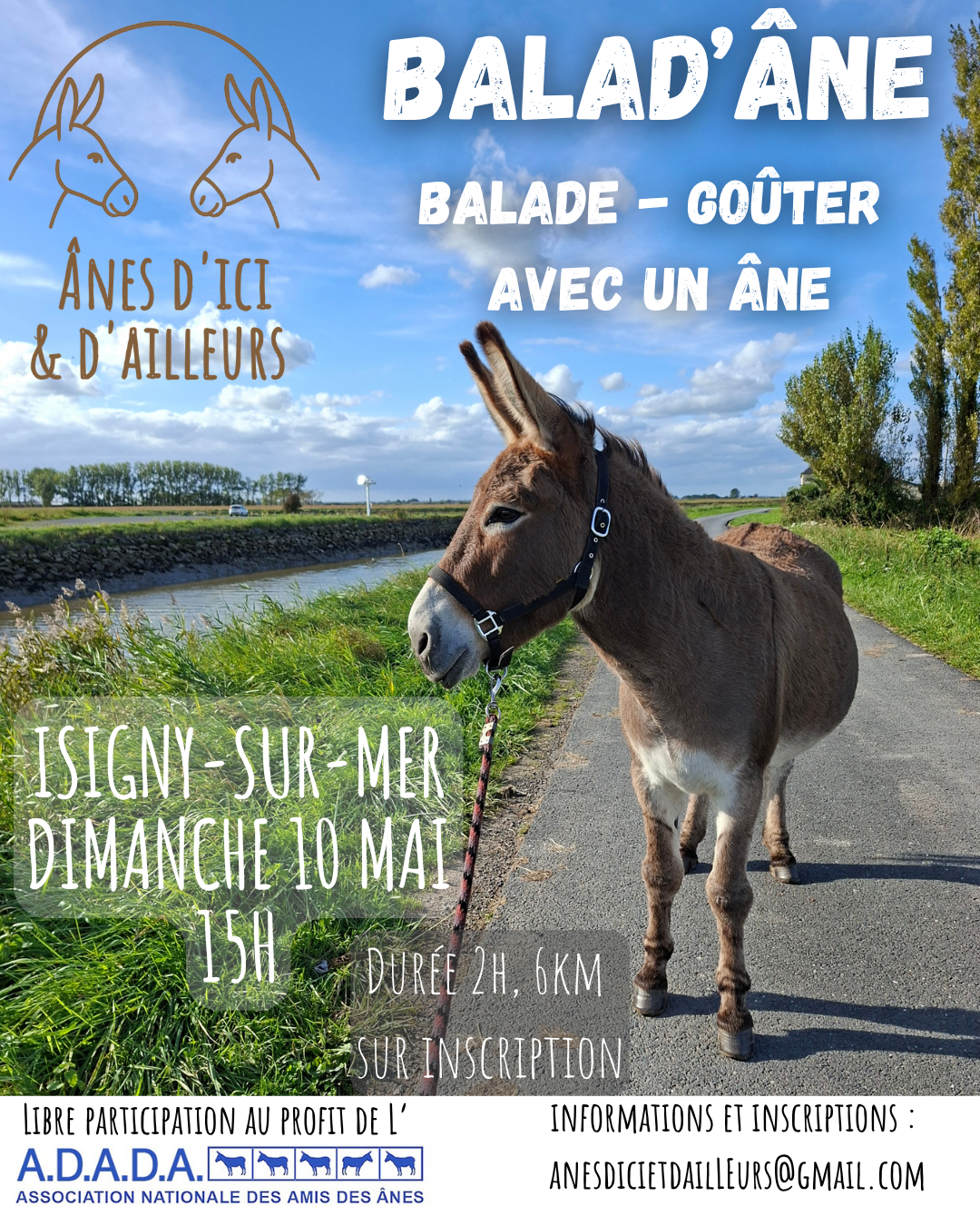Inscription par via l’adresse mail ou la page Facebook de l’association Ânes d’ici et d’ailleurs (Messenger). .