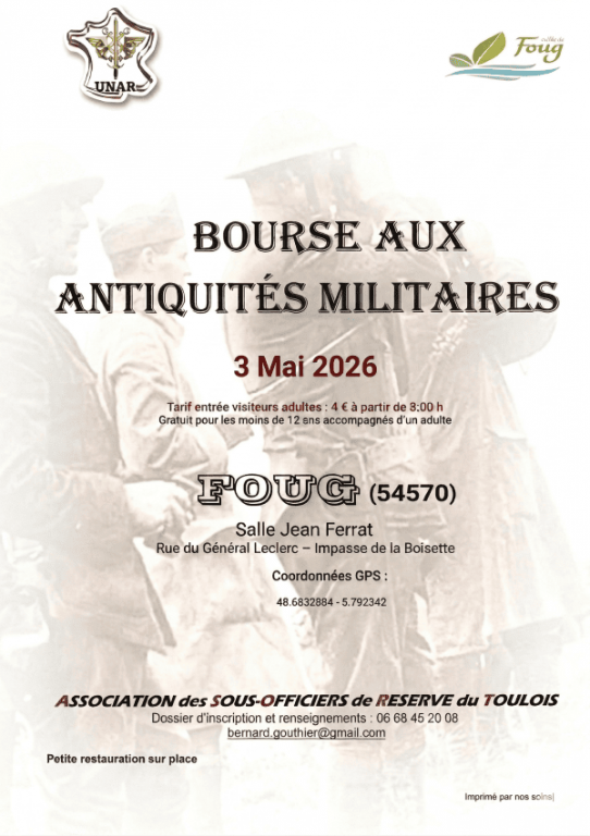 Bourse aux antiquités militaires rue du Général Leclerc Impasse de la Boisette Foug dimanche 3 mai 2026.