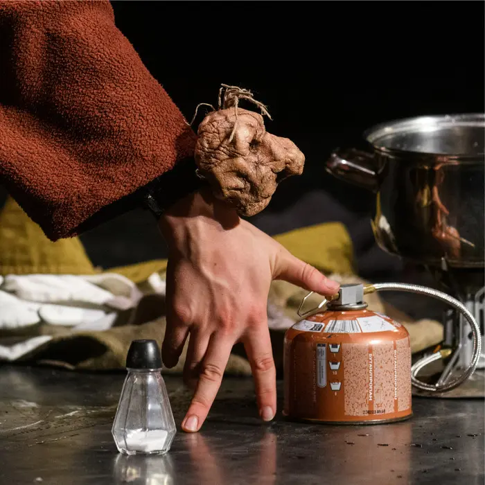 Le spectacle commence et l’on devient le témoin privilégié de la rencontre entre une jeune vagabonde et une vieille patate trouvée au milieu des déchets. Elle s’apprête à la cuisiner mais se laisse attendrir par le petit être joueur et curieux. Une histoire tendre et aussi un peu cruelle. Dans ce doux mélange, deux laissées-pour-compte apprennent à se connaître.