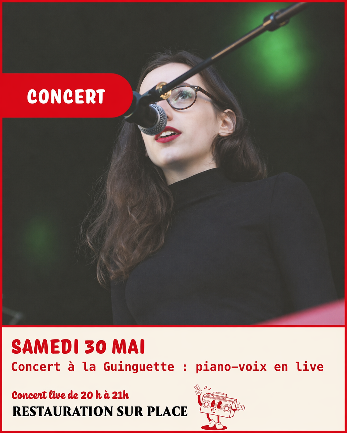 Dans une ambiance conviviale et détendue, laissez-vous porter par un répertoire mêlant douceur et émotions, interprété en live par une artiste au chant accompagné au piano. Ce moment musical intimiste est idéal pour profiter d’une soirée agréable entre amis ou en famille. Une restauration est proposée sur place pour prolonger l’expérience dans un cadre chaleureux. .