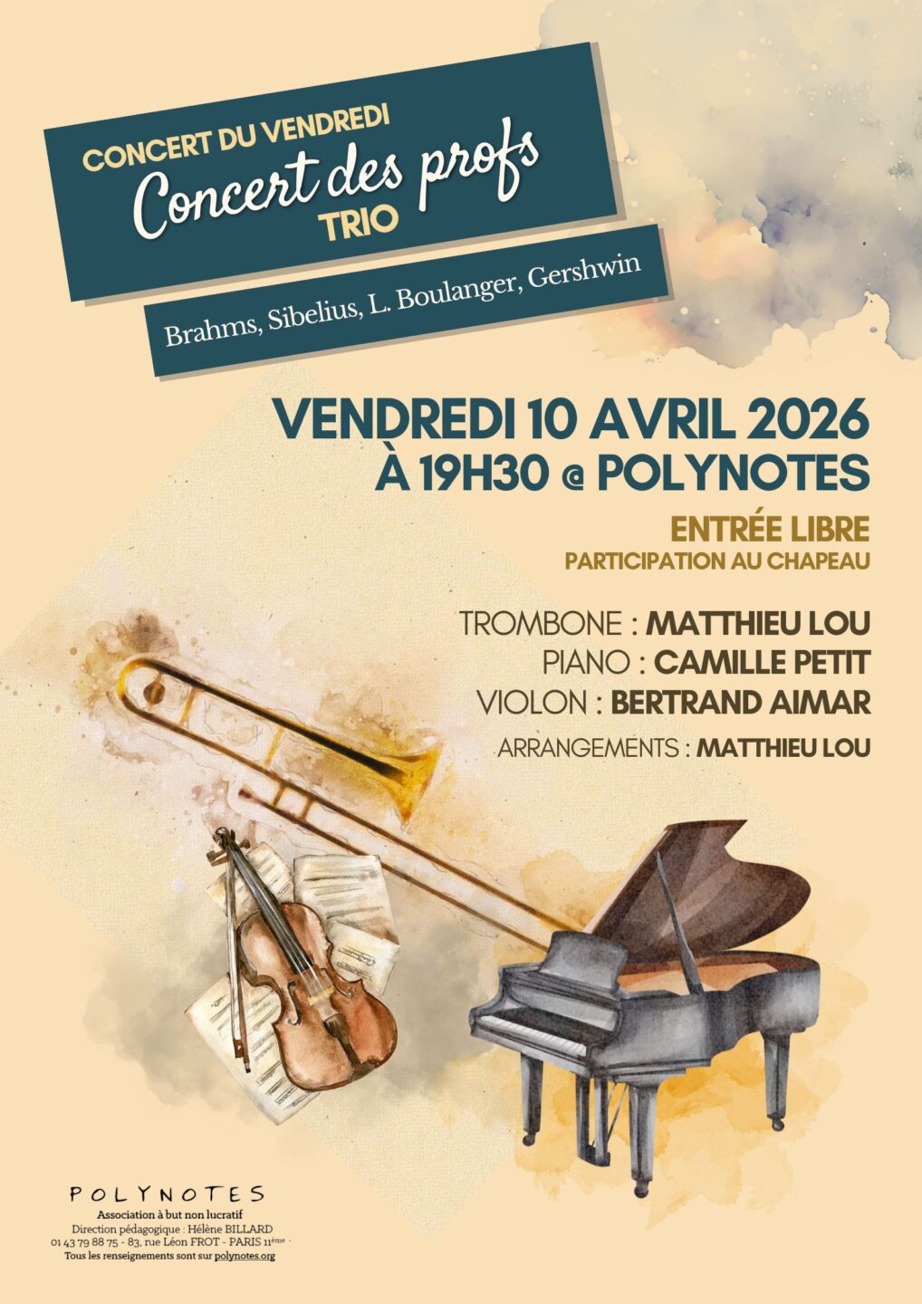 Concert des profs de Polynotes : trio trombone, piano et violon Polynotes Paris vendredi 10 avril 2026.