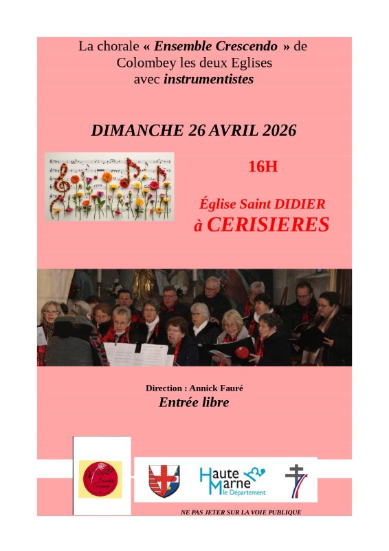 Rendez-vous le dimanche 26 avril pour un concert donné par la chorale Ensemble Crescendo de Colombey les deux Eglises avec instrumenties.