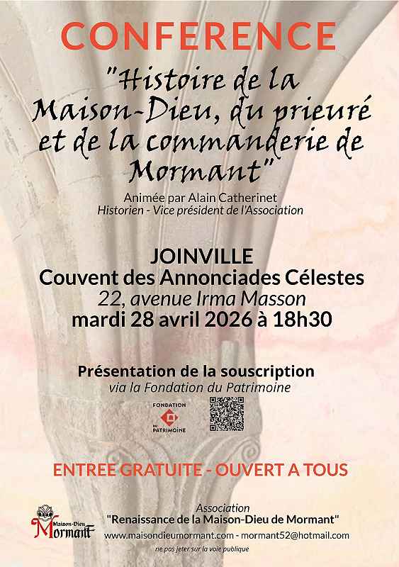 Conférence Histoire de la Maison-Dieu du prieuré et de la commanderie de Mormant Joinville mardi 28 avril 2026.