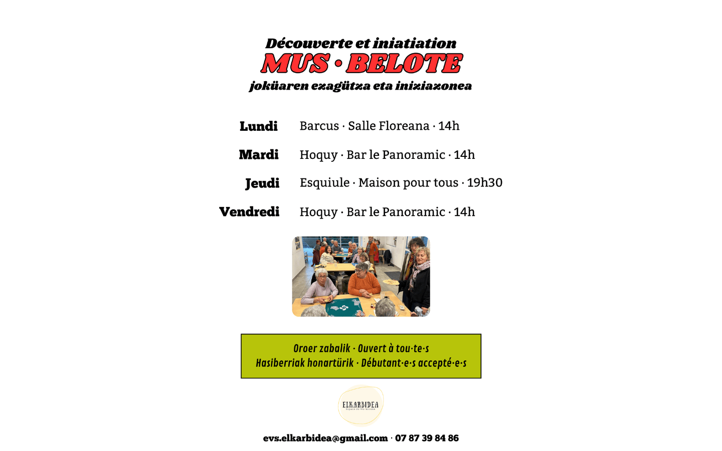Vous souhaitez découvrir et apprendre à jouer au mus, jeu de cartes emblématique ? Ou bien, vous voulez découvrir le jeu de belote ? Réservez votre après-midi. Ouvert à toutes et à tous, les débutants sont les bienvenus. Sur inscription. .