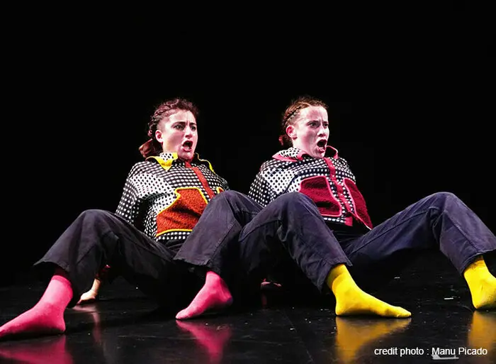 Une armada de vibrations et de multiplications. Jusqu’à du trop trop trop. Elles ont chacune une tête, deux bras et deux jambes et pourtant, elles ne semblent parfois n’avoir qu’un corps pour deux ! Marthe et Elda jouent leur accord imparfait dans leur absurde réalité. Elles se laissent deviner à travers un langage et une gestuelle pleins de tics et de tocs ; on se taquine, s’imite, se coince, se confond, s’entremêle, fusionne et se perdent à nouveau. C’est dans le rapport à l’autre qu’on prend forme. L’embrouillamini mené à son paroxysme en devient cohérent : « un gros bordel organisé ».