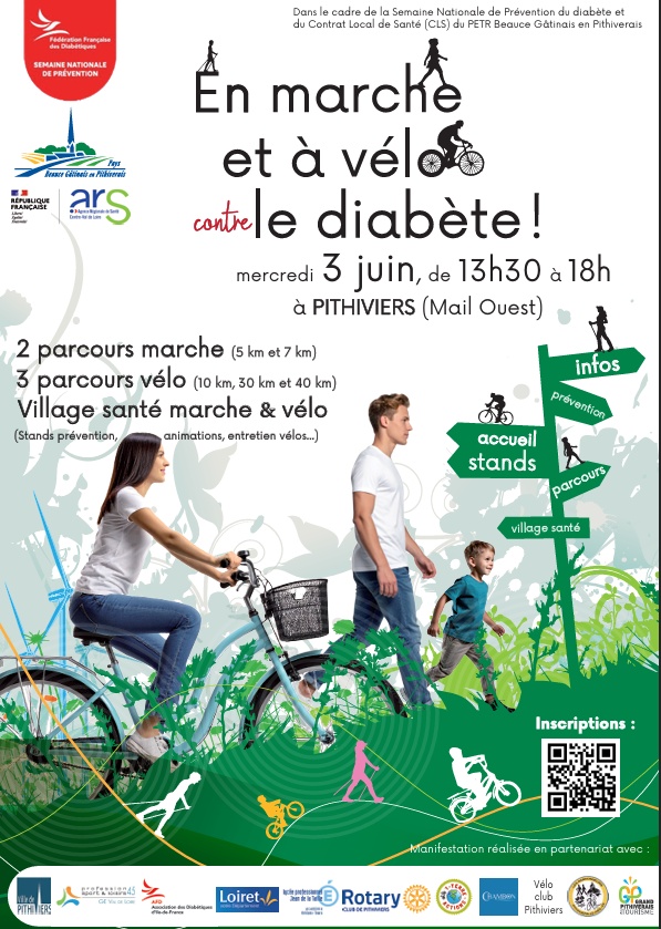 Participez à la journée En marche et à vélo contre le diabète le mercredi 3 juin à Pithiviers ! Au programme parcours de marche (5 et 7 km) et circuits vélo (10, 30 et 40 km). Profitez du Village santé, des animations et des conseils prévention de 13h30 à 18h au Mail Ouest.