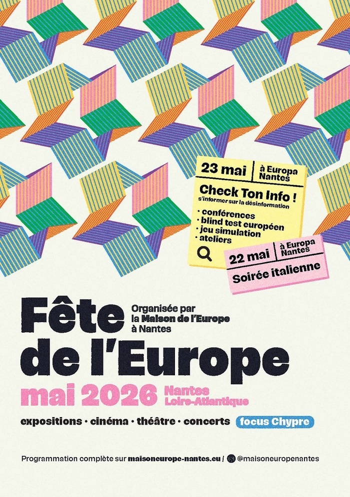 Expositions, soirée de courts métrages européens, concerts et conférences, nombreuses découvertes linguistiques et culturelles… Beaucoup d’événements variés au programme !À ne pas manquer :???? Conférence le 19 mai à 18h à Europa Nantes, avec la présence de l’ambassadrice de France à Chypre, à l’occasion de la présidence chypriote du conseil de l’UE, sur inscription????Conférence le 23 mai à 16h à Cosmopolis, avec la présence notamment d’Emmanuel Lebrun-Damiens, directeur de la communication et de la presse du ministère des Affaires étarngères, sur la désinformation, la manipulation de l’info et les interférences avec le débat public???? Soirée des courts-métrages européens le mardi 5 mai à 18h30 au Katorza???? VAM ! Voyage à Milan ! Une soirée italienne conviviale avec bingo, photos podium et pizza le vendredi 22 mai à 18h30 à la Maison de l’EuropeEt aussi :???? Un blind test européen : l’Union fait la note !????Une balade guidée à vélo au départ d’Europa Nantes pour découvrir l’Europe dans son quotidien???? Un atelier-simulation d’une rédaction The Fact Room, marrainé par Marie Thimonier, journlaiste rédactrice à LibérationRetrouvez toute la programmation ici