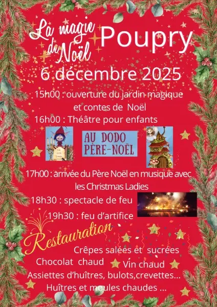 À Poupry, la magie de Noël s’installe le temps d’un après-midi et d’une soirée conviviale. Le jardin magique ouvre dès 15h avec des contes de Noël, suivi à 16h d’un théâtre pour enfants Au dodo Père Noël . À 17h, le Père Noël arrive en musique avec les Christmas Ladies, avant un spectacle de feu à 18h30 puis un feu d’artifice à 19h30. Sur place, restauration gourmande avec crêpes salées et sucrées, chocolat chaud, vin chaud, assiettes d’huîtres, bulots, crevettes, huîtres et moules chaudes pour prolonger la soirée entre voisins et familles. 0 .