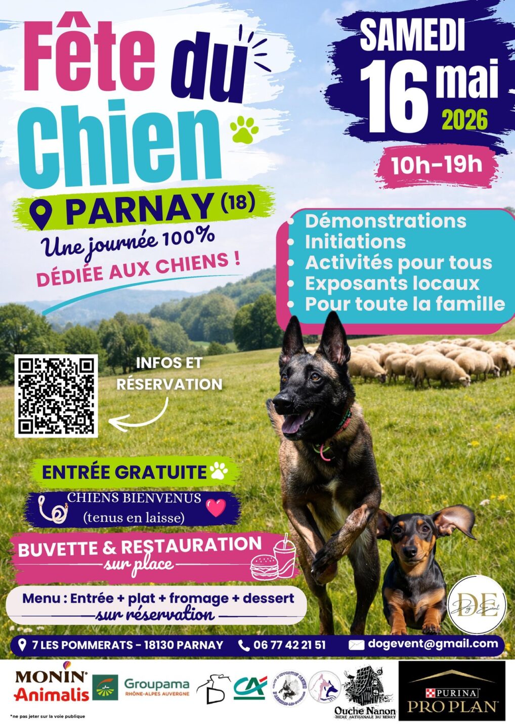 Dog Event organise la fête du chien samedi 16 mai 2026 de 10h à 19h à Parnay. Une journée conviviale avec activités, découvertes et rencontres, ainsi qu’une offre de restauration.