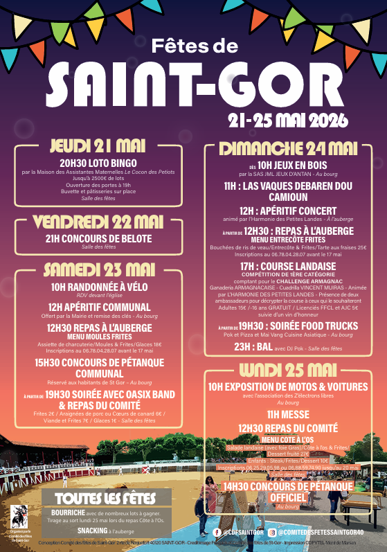 For 5 days, the village of Saint-Gor vibrates to the rhythm of its annual festivities! The Comité des Fêtes has put together a rich program to celebrate the Landes spirit!
