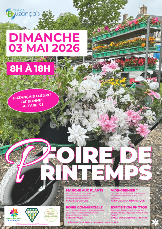Buzançais s’animera le samedi 3 mai 2026 pour une journée haute en couleurs à l’occasion de la traditionnelle Foire de printemps ! De 8 h à 18 h, la ville vivra au rythme des exposants, des artisans et des commerçants, avec un programme riche pour tous les âges et toutes les envies.
