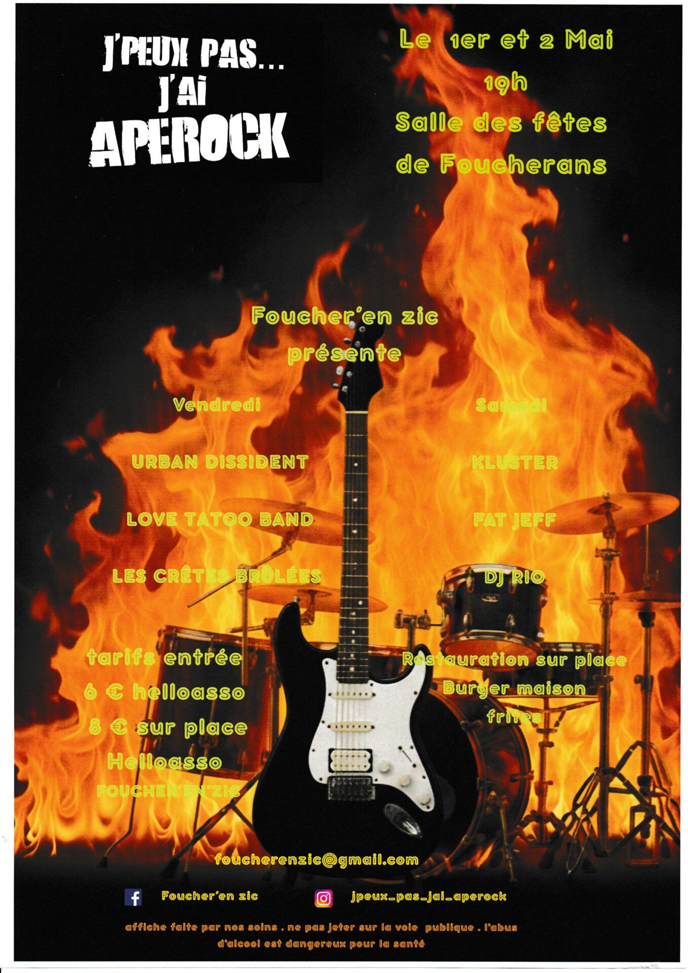 Foucher’en zic vous donne rendez-vous le 1er et 2 Mai pour J’PEUX PAS J’AI APEROCK. Salle des fêtes de Foucherans. Venez découvrir URBAN DISSIDENT, LOVE TATOO BAND, LES CRÊTES BRÛLÉES pour le vendredi et KLUSTER, FAT JEFF, DJ RIO pour le samedi. Restauration sur place. .