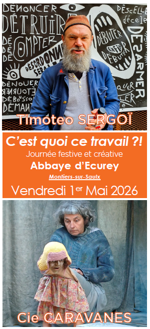 – 13h30 atelier artistique participatif, écriture, poésie et linogravure, création d’affiches avec sur le thème du travail, le travail rêvé, le travail réel, le travail solitaire… Venez questionner la place du travail dans le monde et dans votre vie avec Timoteo Sergoï.